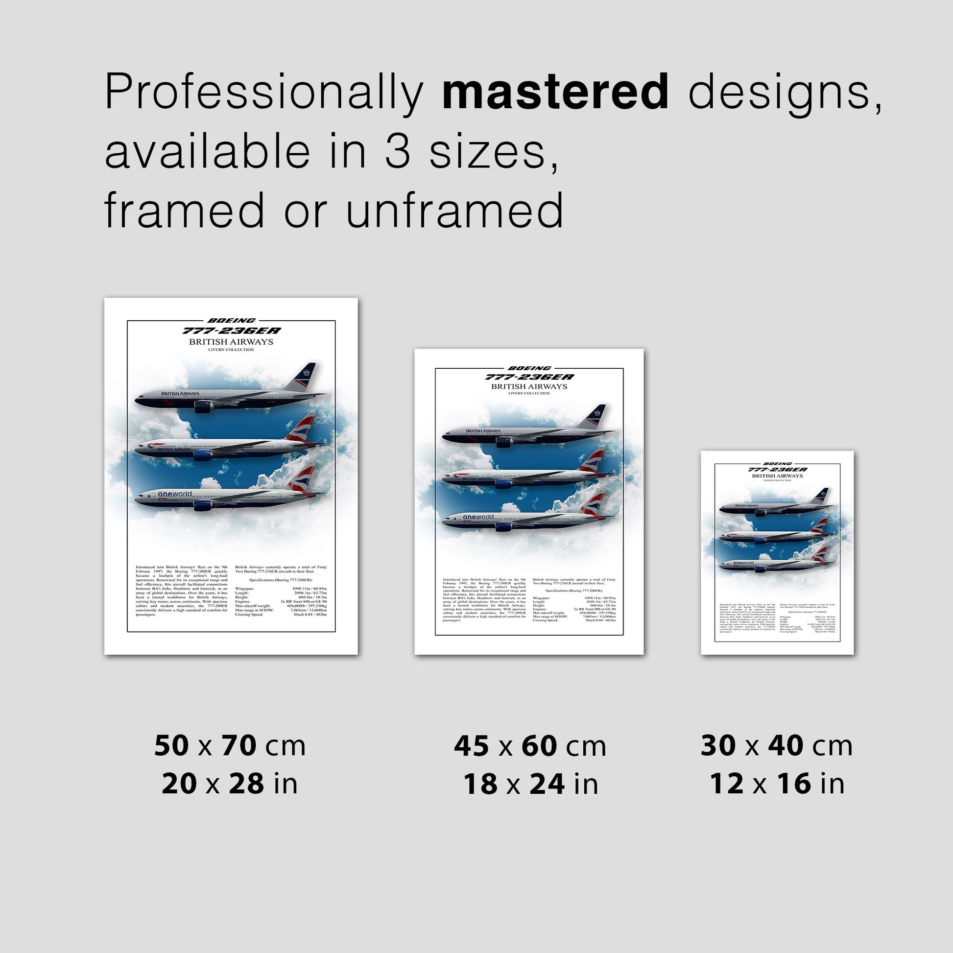 Detailed British Airways Boeing 777-200 Profiles print, featuring 3 different liveries, available framed or unframed, part of our British Airways Fleet collection.